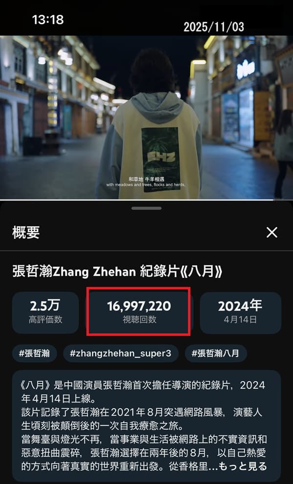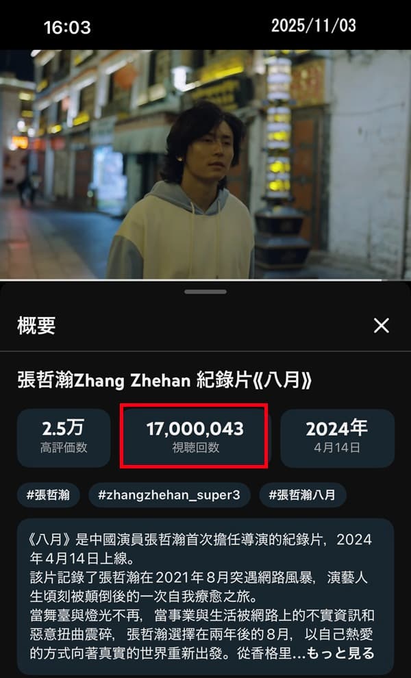 チャンジャーハン監督の映画「8月」、今日1700万回再生を突破!