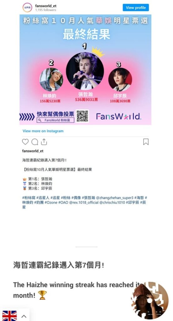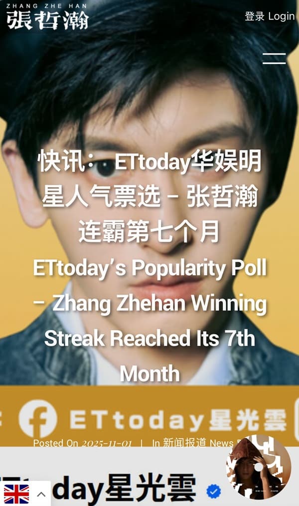 チャンジャーハン公式サイト、ニュースページ更新「ETtodayの中国芸能人人気投票で、張哲涵が7ヶ月連続で1位を獲得」