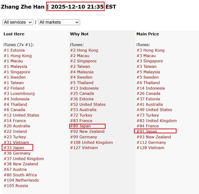 iTunesチャート「TOP100入りしている国」リスト|日本でも3曲ともTOP100入り