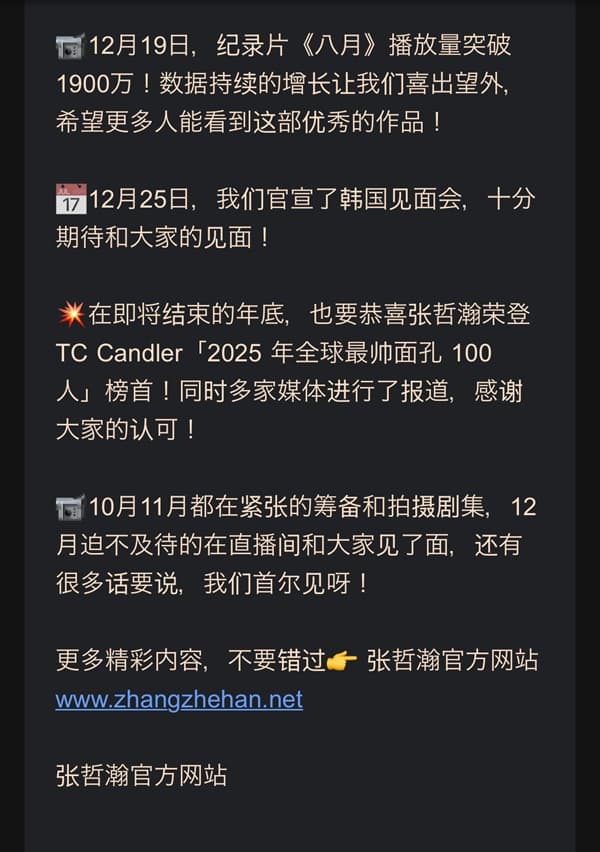 💥 年末を迎えるこのタイミングで、チャン・ジャーハンが TC Candler「2025年 世界で最もハンサムな顔100人」ランキングで第1位 に輝いたことも、改めてお祝い申し上げます!