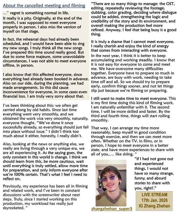 チャンジャーハンの1/17インスタ生ライブ「ソウルファンミが中止になった件、そして撮影の話」(和訳)