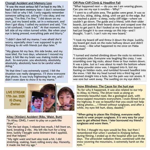 チャンジャーハン、1/17インスタ生ライブ内容②「スキー場での転倒事故の話」(詳細和訳)