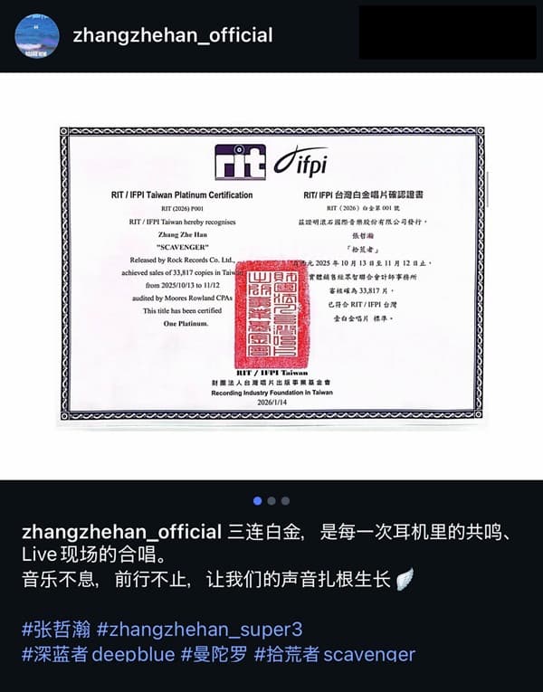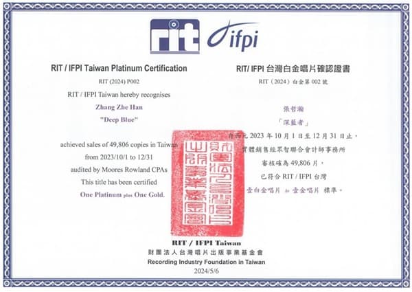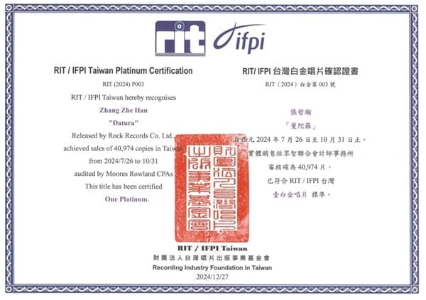 ここに証明する。チャン・ジャーハンアルバム「拾荒者(SCAVENGER)」は、2025年10月13日から11月12日までの期間、台湾地域において実売3万3,817枚を達成し、会計監査による認証を経て、IFPI台湾よりプラチナアルバム認証を授与する。