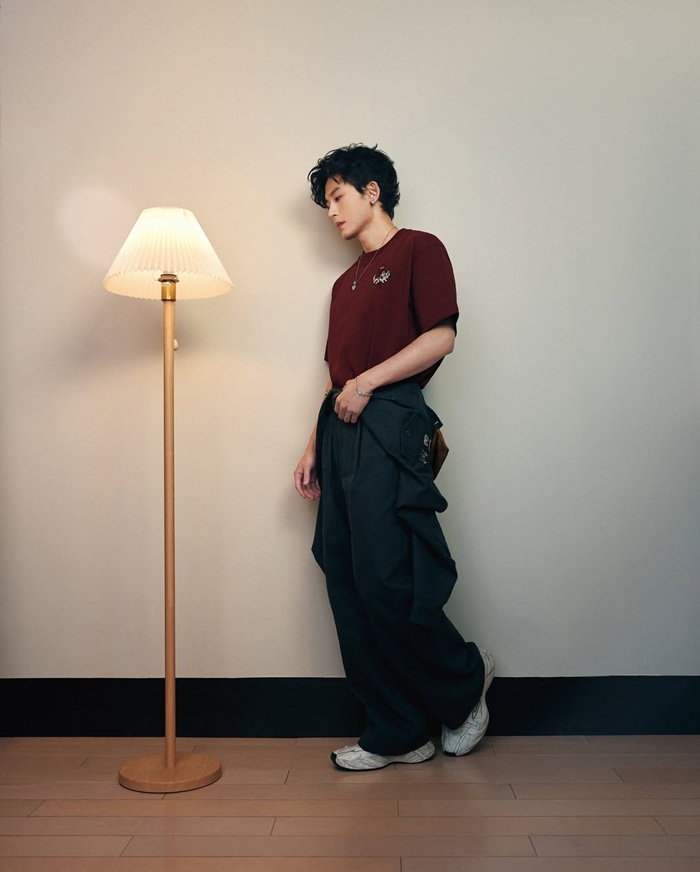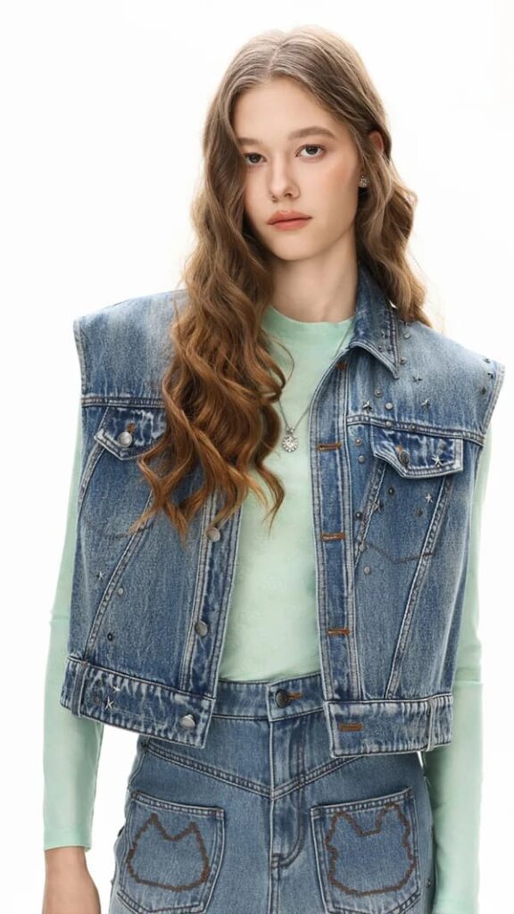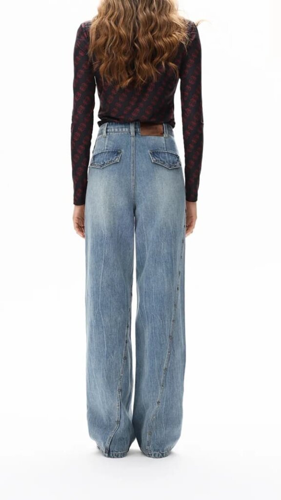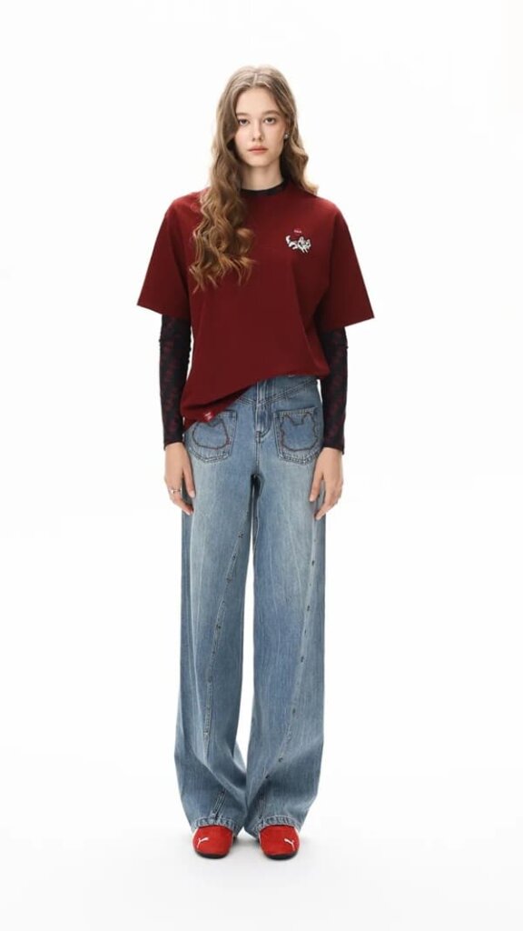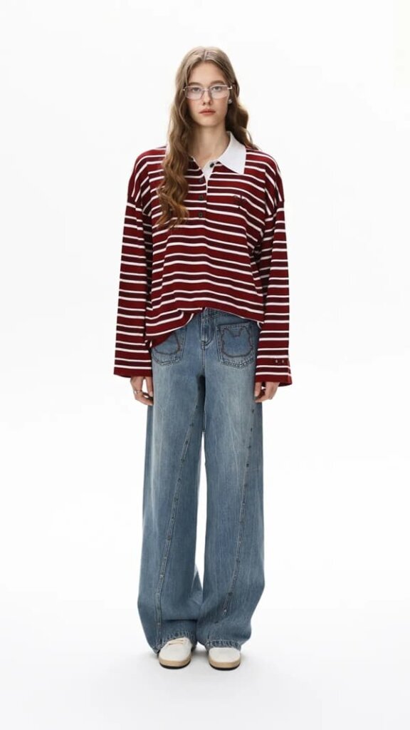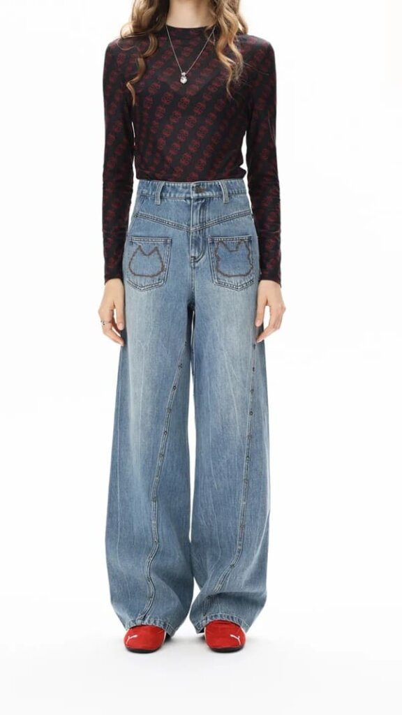 倒T型シルエットで幅広い体型に対応し、斜め切り替えやポケット、カスタムスタッズなどブランドらしいデザインが特徴です。