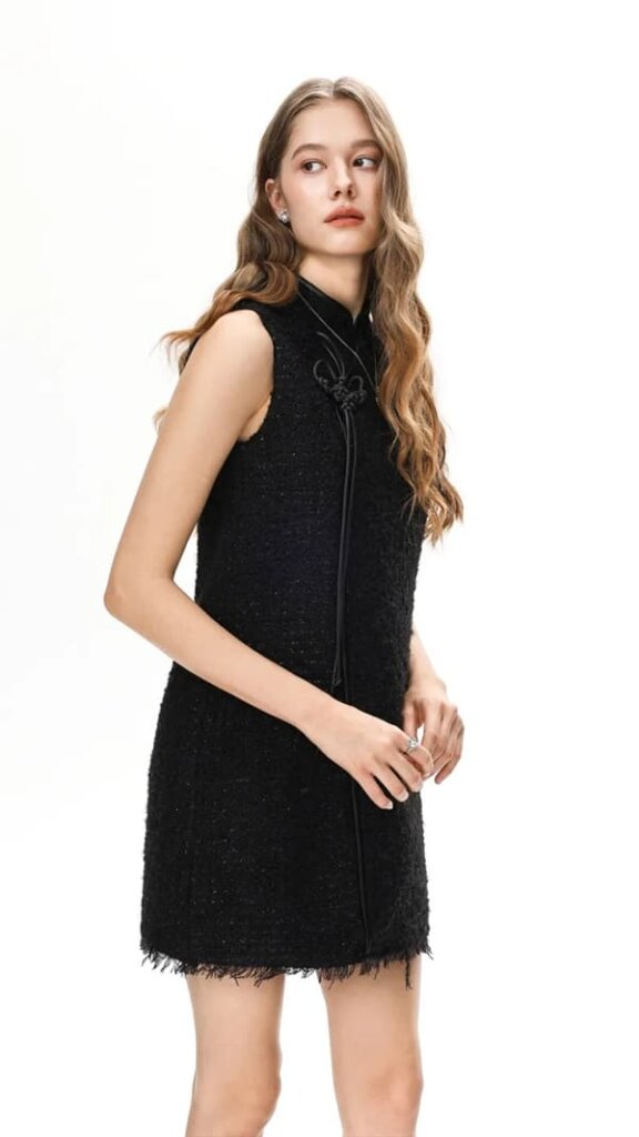 チャイナドレスをベースに、立ち襟や斜め切り替え、中国結び装飾を取り入れたデザインです。