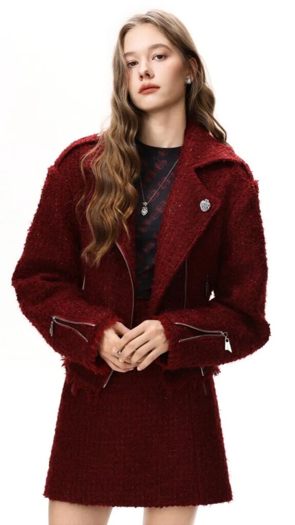 ウール糸とポリエステル糸を織り合わせた立体感ある生地に、ラメ糸を加えた上品な質感。