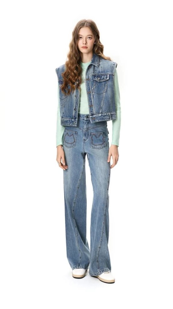 同デニム素材のハイウエストパンツ。