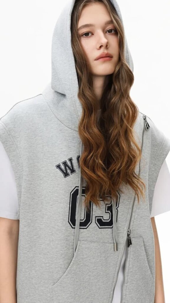 フード付きオーバーサイズシルエットで、非対称デザインが特徴です。