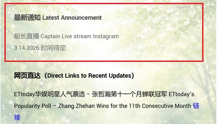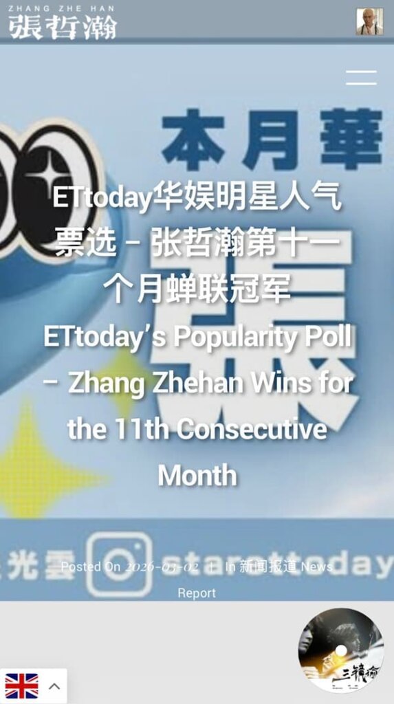 公式サイトにもニュース掲載!「ETtoday華語エンタメスター人気投票 – 張哲瀚が11か月連続でチャンピオンを獲得」