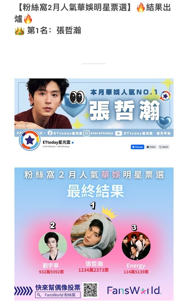 ETtoday華語エンタメスター人気投票 – 張哲瀚が11か月連続でチャンピオンを獲得。