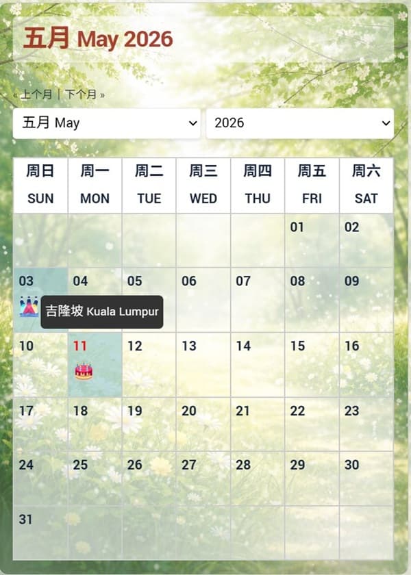 公式サイトのトップページ 5月カレンダーに「クアラルンプール5月3日」表示