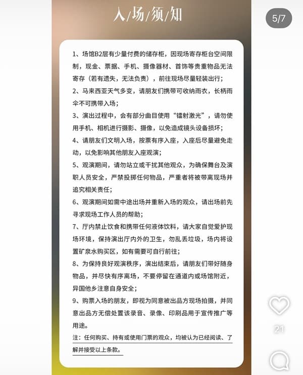 4.文明的に入場し、順序に従って着席してください。入場後はできるだけ走らず、周囲の観客の安全な観覧に影響を与えないようにしてください。