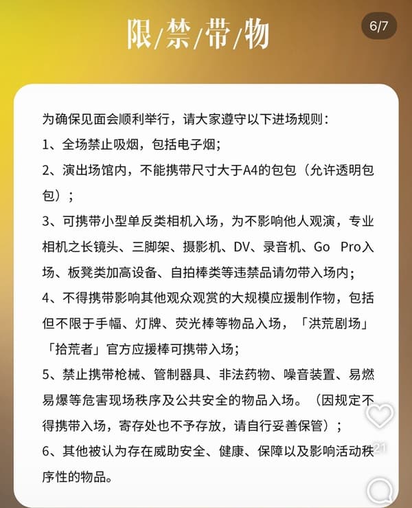 7.会場内は飲食および液体飲料の持ち込み禁止です。現場の規定を守り、会場内外の衛生を維持し、ゴミの投棄は禁止です。場内には給水エリアが設置されており、必要な場合は自分で利用してください。